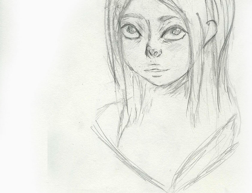 This piece was a quick sketch, I made it with pencil and took me about ten minutes to make it. I was inspired by animated characters and decided to give her a kind of Asian look. One of signature elements are weird noses, here I used it, on my perspective it gives a weird element to the drawing.